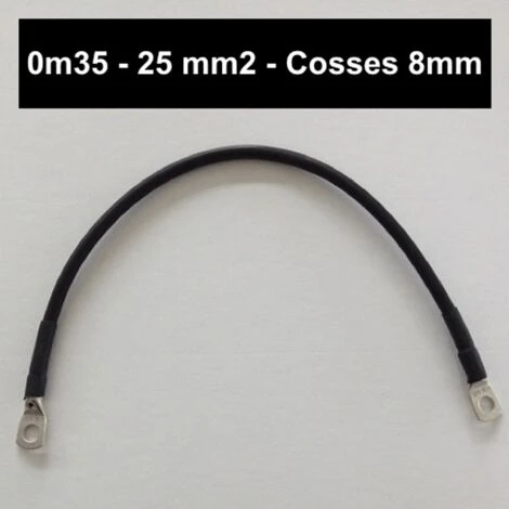 Câble d’alimentation pour batterie de couleur noir en 25mm² et d’une longueur de 35cm, équipé de 2 cosses rondes perçage M8, pour le câblage des batteries entre elles et comme câble d’alimentation entre les batteries et les convertisseur DC/AC. Idéal pour vos équipements solaires. Bonne résistance aux vibrations, à la chaleur, aux huiles et aux graisses.
