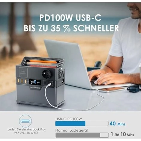 - ▶【5 méthodes de recharge】 : le générateur solaire ALLPOWERS a 5 façons de charger la batterie de secours. Il faut environ 3 heures pour recharger complètement la centrale électrique portable par prise murale AC 230 V + PD USB-C 60 W en même temps ; environ 4,5 à 5 heures. sous la lumière directe du soleil avec panneau solaire (80W Max et vendu séparément, non inclus), 5-6 heures par prise USB-C 60W (max) (non incluse) et 3-7 heures par prise de voiture 12V/24V (vendue séparément) .