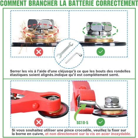 2.Lorsque vous connectez les fils à la batterie au lithium, sertissez les bornes appropriées et choisissez-les en fonction de la taille du courant. N’enroulez pas les fils directement autour des boulons positif et négatif de la batterie au lithium.