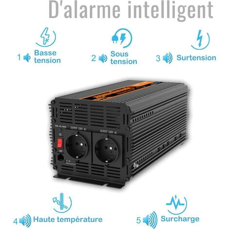 Le convertisseur 2000w 24v 220v a une multi-protection, donc en cas de problème dans l’installation, l’onduleur se mettra en protection et l’alarme commencera à sonner, en fonction du nombre de fois par seconde que l’alarme sonnera, elle être capable d’identifier le convertisseur de problème