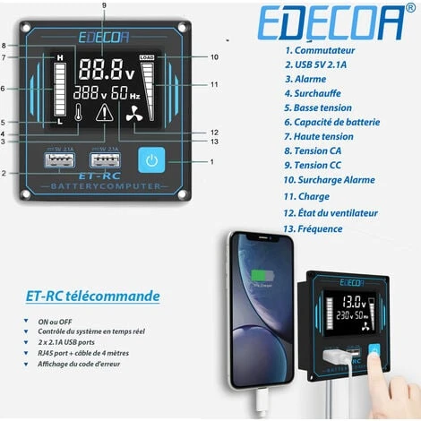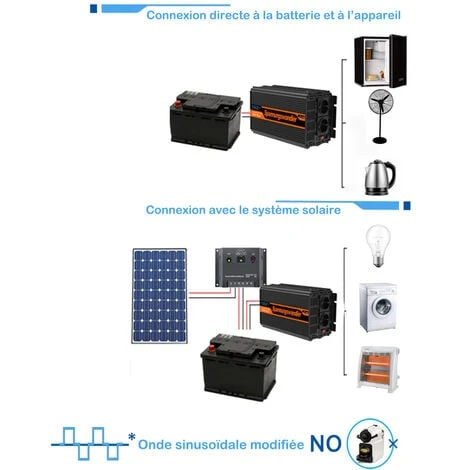 - L’onduleur est à onde sinusoïdale modifiée, il ne fonctionne PAS avec les appareils de charge inductive tels que les machines à café à capsules Nespresso, pour ces appareils, une onde sinusoïdale pure est nécessaire.