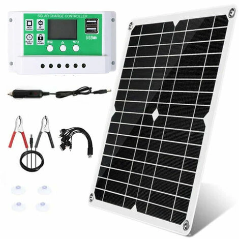 L’ensemble de panneaux solaires pratique comprend un panneau solaire, un contrôleur de charge solaire, des clips de batterie, un câble de charge de voiture, un chargeur de téléphone 10 en 1 câble et 4 ventouses.