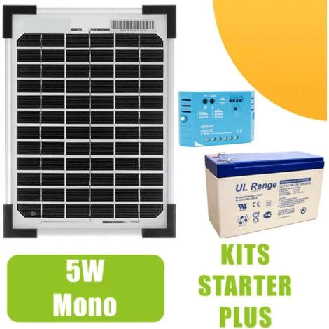 Kit Panneau solaire 5W type monocristallin gamme professionnelle 12V avec rĂ©gulateur de charge 5A et batterie 12V 7 Ah. Pour petites installations solaires nĂ©cessaires au fonctionnement de petits Ă©clairages, d’une pompe ou de tout autre dispositif se trouvant sur un site isolĂ©.