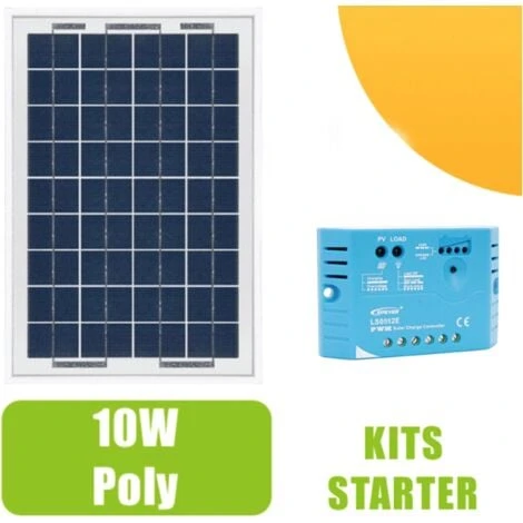 Kit Panneau solaire 10 W de type polycristallin 12 V et son rĂ©gulateur 5 A. Pour petites installations solaires nĂ©cessaires au fonctionnement d’Ă©clairages, d’une pompe ou de tout autre dispositif se trouvant sur un site isolĂ©.
