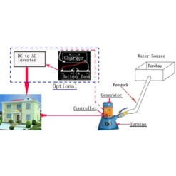 1) Un système AC direct hors réseau avec turbine turgo intégrée, générateur et contrôle du débit de la vanne. Conçu pour fournir une alimentation AC 115V/230V prête à l’emploi, il utilise un alternateur à aimant permanent spécial terre rare sans balais et a donc un rendement supérieur à celui d’un alternateur ordinaire. La tension et la fréquence de sortie sont contrôlées par le contrôleur de charge électronique (avec ballast). La puissance est surveillée et celle qui n’est pas utilisée par les appareils est dirigée vers le ballast.