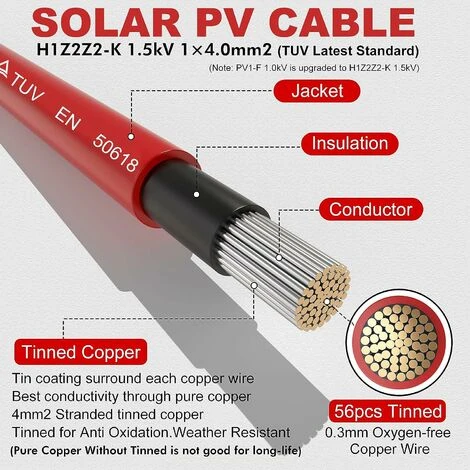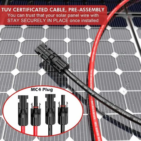 est fabriqué en cuivre étamé, un fil de qualité supérieure qui protège contre la rouille et l’oxydation qui accompagnent souvent la pluie, l’humidité, les environnements salins et les climats chauds. Notre câble pour panneaux solaires, très durable et résistant aux intempéries, est conçu pour durer plus de 30 ans après son installation. </span></li> De nombreux câbles s’avèrent être défectueux ou mal raccordés, ce qui rend leur connexion difficile. nous prenons la qualité et la sécurité très au sérieux. Ainsi, notre connecteur panneau solaire est titulaire d’un certificat TUV attestant qu’il a été évalué sur le plan de la sécurité et vérifié minutieusement pour détecter les défauts. Il est également pré-serti pour une connexion plus sûre et plus ferme – il restera donc bien en place une fois installé. </span></li> Qualité professionnelle – Avec une tension de 1500 V, cette rallonge pour panneau solaire de 2 mètres, 12-AWG, a un indice de protection contre les intempéries IP67, avec une température de fonctionnement de -40°C à +90°C. Notre kit pour panneau solaire de 4mm est également isolé par une polyoléfine réticulée (XLPO), un matériau à faible toxicité connu pour être ignifuge, résistant aux UV et très flexible. </span></li> Nous sommes totalement transparents avec nos clients. Nos câbles et connecteurs pour panneaux solaires sont conformes aux réglementations nationales, régionales et internationales, et ont reçu des évaluations de la norme IEC pour les câbles solaires (IEC 60228), la qualité des conducteurs (IEC 60228) et le test de la flamme (IEC 60754). </span></li>